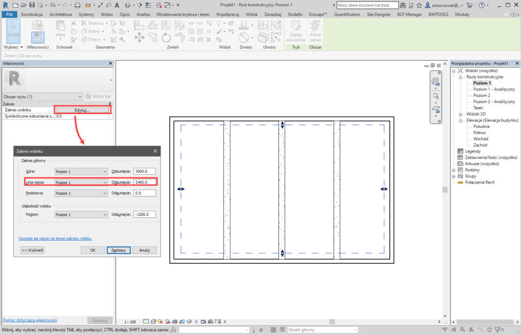 W naszym przykładowym projekcie wyznaczymy prostokątny zakres obszaru rzutu, w którym obowiązywać będą inne wysokości cięcia – w tym przypadku obejmujące belki. Tworzymy prostokąt na bazie wewnętrznych krawędzi ścian – dokładność nie jest tu konieczna, wystarczy, że prostokąt przetnie swoją krawędzią belkę. We Właściwościach obiektu Zakres widoku, w wierszu Zakres widoku klikamy Zakres i zmieniamy poziom cięcia, aby obejmował belki. W przypadku belek żelbetowych 300x600mm, użytych w tym projekcie przykładowym wystarczy poziom cięcia 2400mm aby belki zostały wyświetlone.
