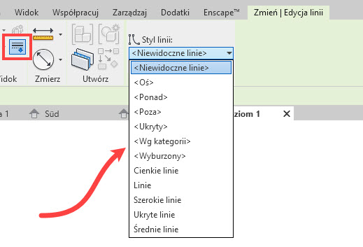 Polecenie  (Edycja linii) znajdziemy w zakładce Zmień na panelu Widok. Można też użyć skrót klawiszowy LW. Po wywołaniu polecenia we wstążkowym menu kontekstowym Edycja linii na panelu Styl linii wybieramy z listy styl linii jaki ma zostać przypisany do krawędzi