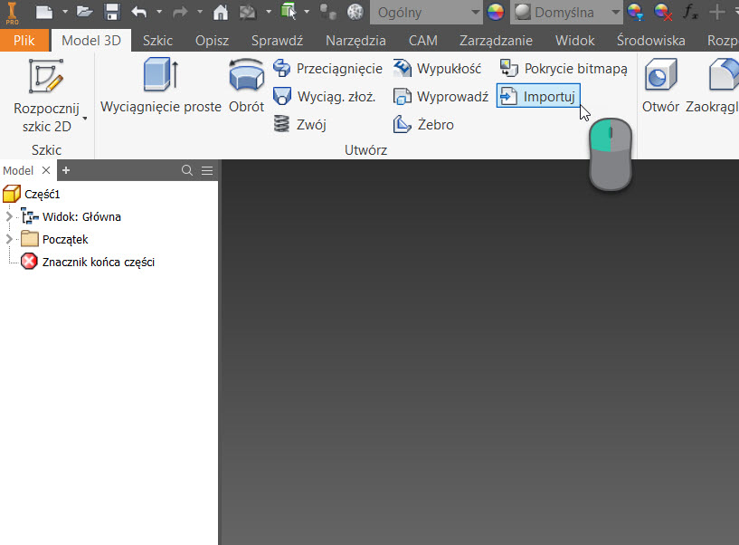 Aby wczytać plik DWG do Inventor-a będąc w edycji części należy na panelu Utwórz wybrać polecenie Importuj.