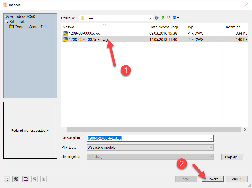 W nowo otwartym oknie należy wskazać plik DWG a następnie wybrać polecenie Otwórz.