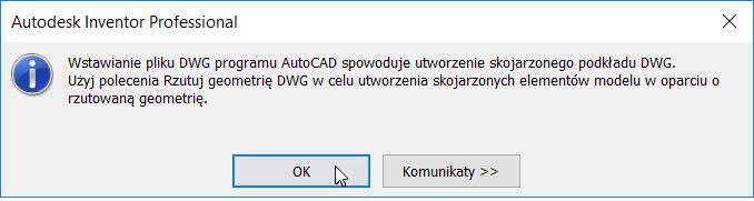 Pojawia się komunikat informujący o tym, że plik DWG zostanie skojarzony z plikiem IPT Inventor-a i aby skorzystać z geometrii DWG należy dokonać jej rzutowania za pomocą specjalnego polecenia.