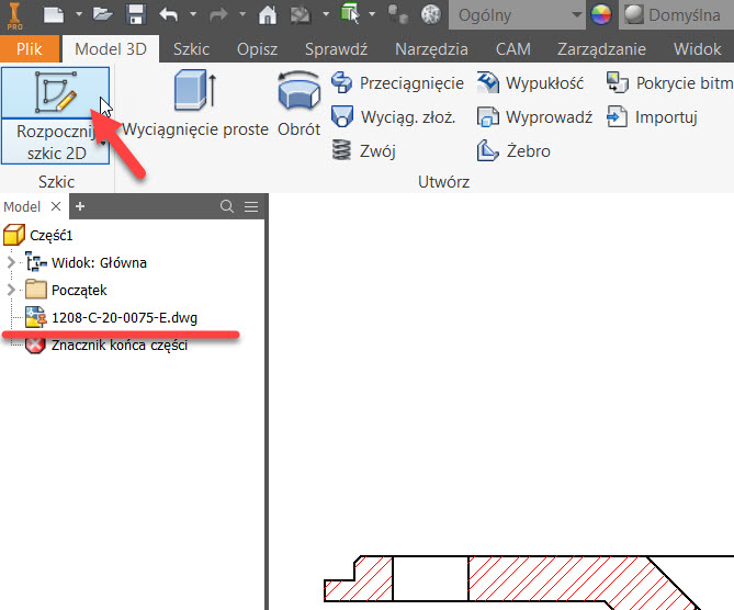 Plik DWG trafia do przeglądarki Inventor-a i można go teraz wykorzystać do utworzenia modelu 3D. Aby to zrobić należy uruchomić polecenie Rozpocznij szkic 2D.