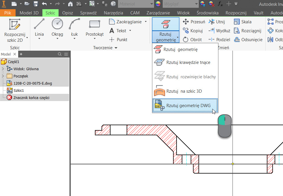 W zakładce Szkic na wstążce należy wybrać polecenie Rzutuj geometrię DWG a następnie trzeba wskazać linie które mają zostać przerzutowane.