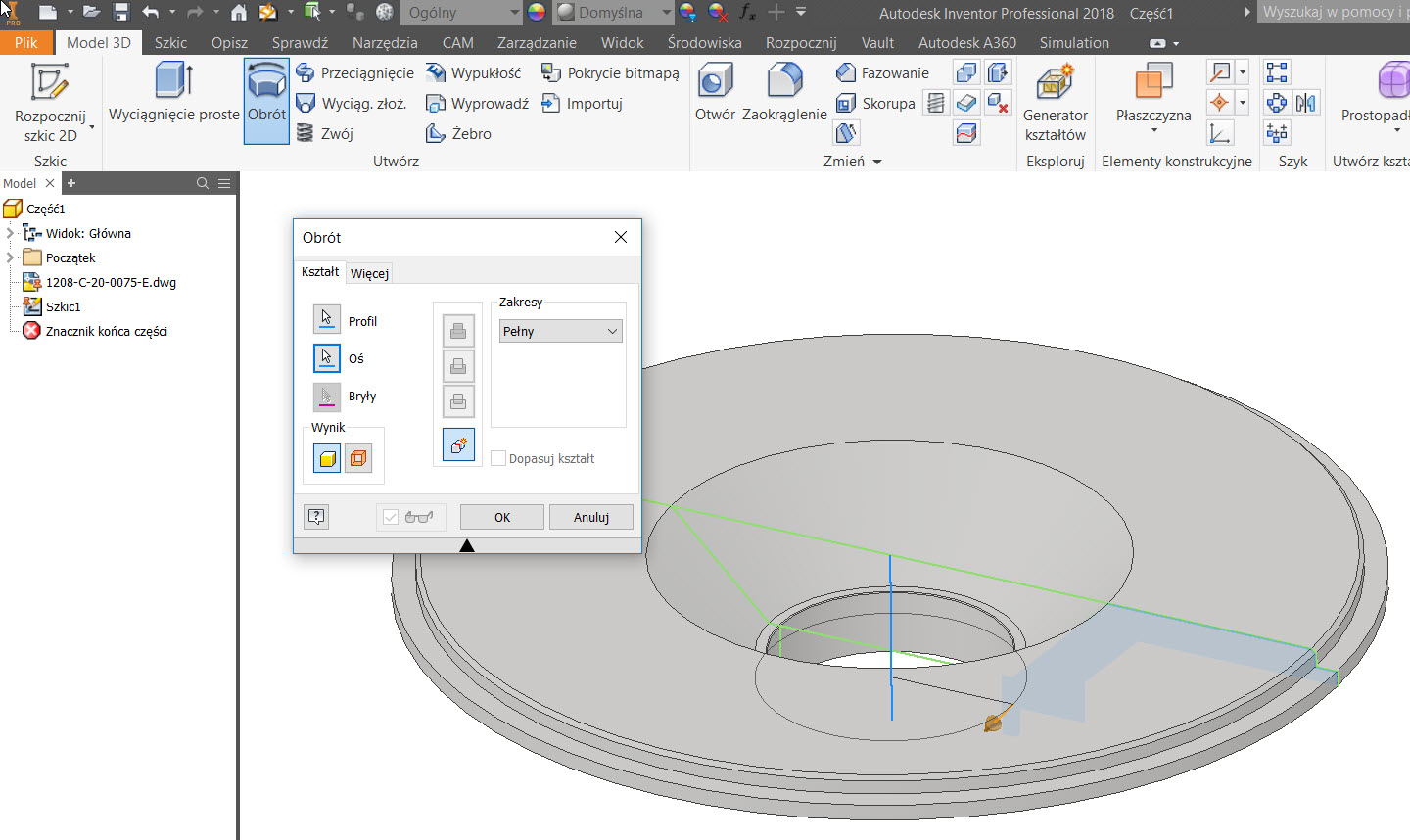 Przerzutowaną geometrię można traktować jak szkic Inventor-a, dlatego możliwe jest np. wyciągnięcie obrotowe.