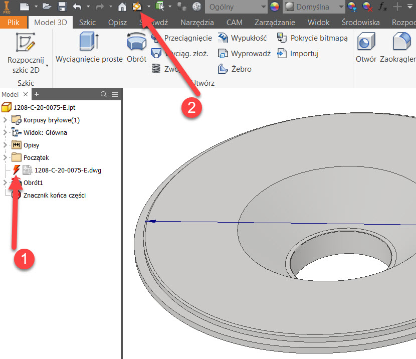 Jeżeli geometria w pliku DWG zostanie zmodyfikowana np. za pomocą AutoCAD-a to Inventor w przeglądarce wyświetli informację o konieczności aktualizacji (1) i będzie możliwe jej dokonanie z poziomu ikony (2) znajdującej się na pasku szybkiego uruchamiania.