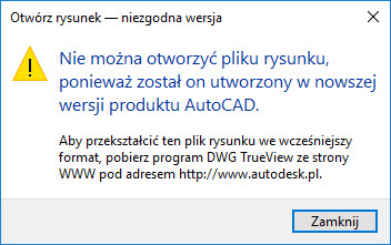 Nic straconego, ponieważ firma Autodesk udostępnia darmowe narzędzie o nazwie DWG TrueView, dzięki któremu możemy m.in. przekonwertować pliki DWG do starszej wersji. Czytając komunikat z okienka, możemy dowiedzieć się z jakiej strony pobrać oprogramowanie. Program nie występuje w wersji polskiej.
