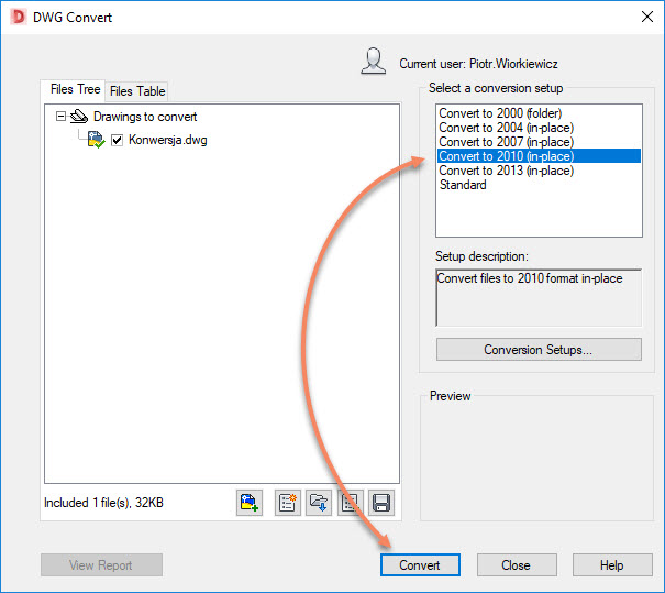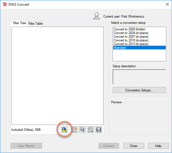 Przy pomocy tego narzędzia możemy przekonwertować kilka plików naraz. Mogą być to również pliki o różnych wersjach DWG. Jest to szczególnie przydatne jeśli przygotowaną przez nas w nowszym AtoCADzie dokumentację chcemy przenieść na komputer, gdzie posiadamy starszą wersję oprogramowania.