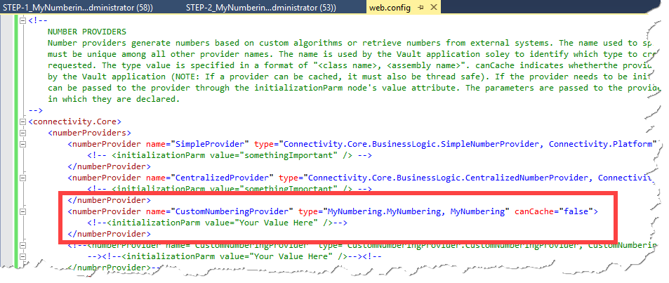 <numberProvider name=”CustomNumberingProvider” type=”MyNumbering.MyNumbering, MyNumbering” canCache=”false”>