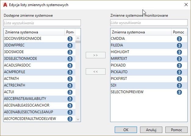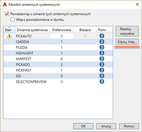 Po wybraniu przycisku Edytuj listę uzyskujemy dostęp do wszystkich zmiennych systemowych jakie są w obecnej wersji programu AutoCAD.